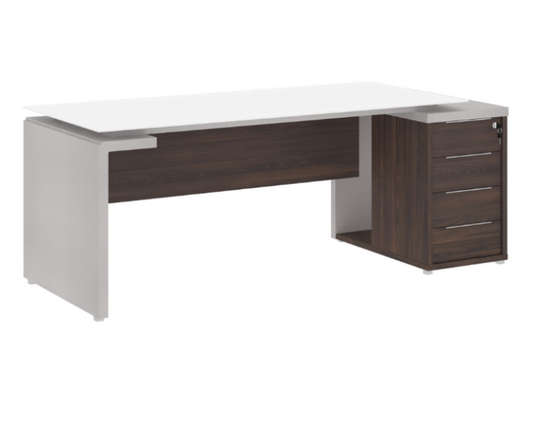 A Mesa Diretor Dinâmica com Tampo em Vidro e Gaveta Lateral - EDGE GEBB WORK é uma solução sofisticada e funcional para ambientes de trabalho, ideal para diretores e executivos que buscam um espaço moderno e prático.